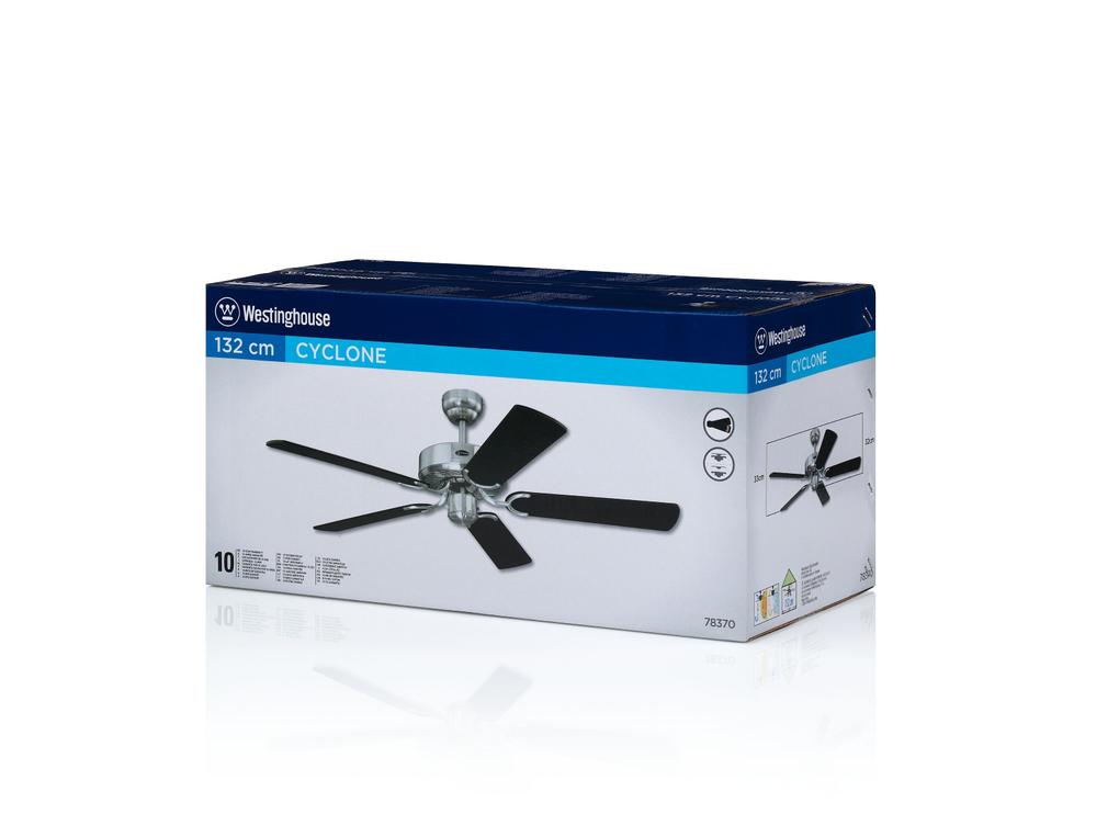 Casablanca-styleThe Westinghouse Cyclone ceiling fan is our proven classic without lighting. The brushed steel housing surface and the blades in black and black with silver stripes have cult status.