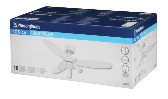 Add a classic touch to your home with the energy-efficient 105-cm Jet Plus ceiling fan. The white finish, sleek silhouette, and spotlight kit have a fresh, modern look that enhances any space. Reversible blades are included with two coordinating finishes to match your decorative style easily, and the spotlights direct light where needed. Choose the white blade finish for a clean, monochromatic look that blends seamlessly into a room, or choose the light maple finish to add textural contrast and warm touch.