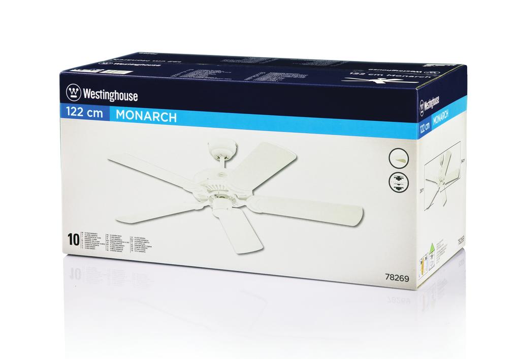 Contemporary aesthetic in whiteThe Westinghouse Monarch belongs to the category with both modern as well as traditional-style ceiling fans. The housing surfaces in white and the 5 reversible blades in white and white with rattan cane characterize the discreet appearance of the monarch.