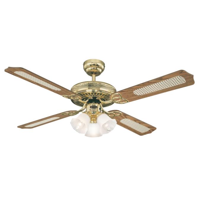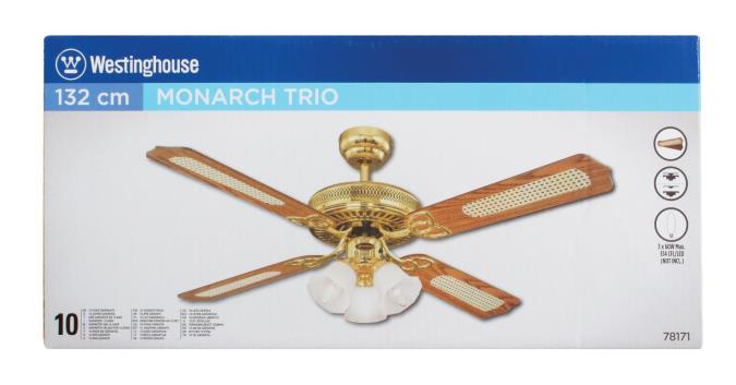 The originalThe design of the Westinghouse Monarch Trio ceiling fan is pure tradition. The design in polished brass, the decorative 3 light fixture and 4 reversible blades in oak with rattan and mahogany give the Monarch Trio its high quality historic design.
