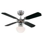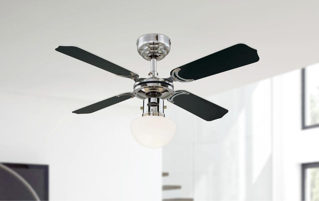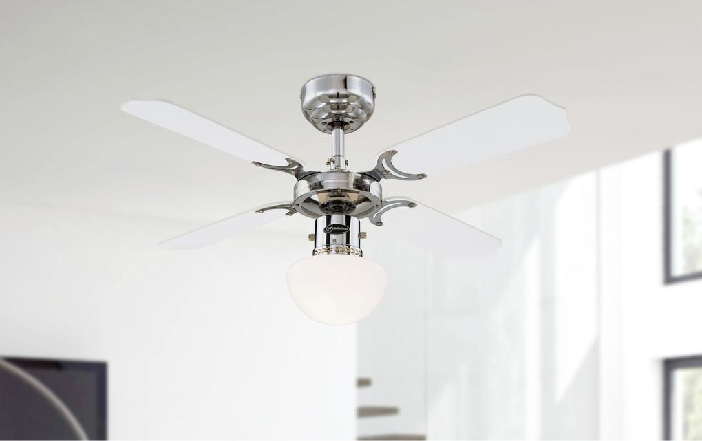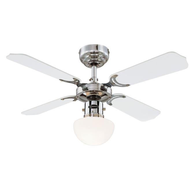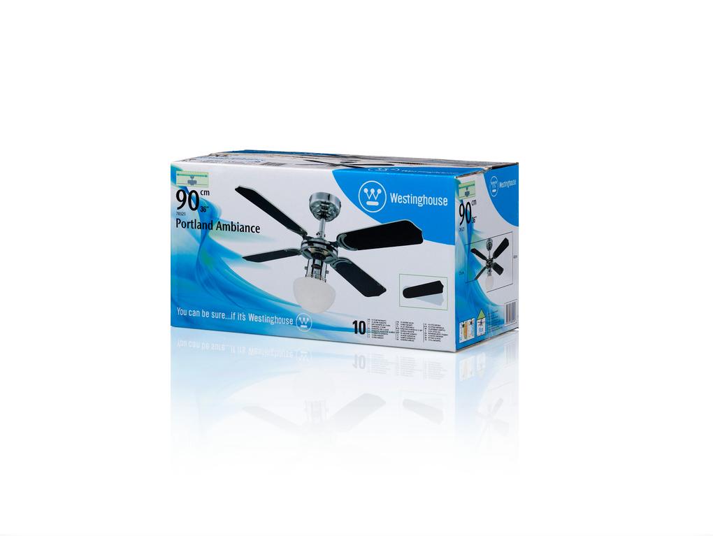 Entry level model for demanding applicationsThe proven Westinghouse Portland Ambiance ceiling fan has a timeless classic and functional design. The chrome housing surface, the single light with opal glass and the 4 attached reversible blades in white and black give the Portland Ambiance a premium look.
