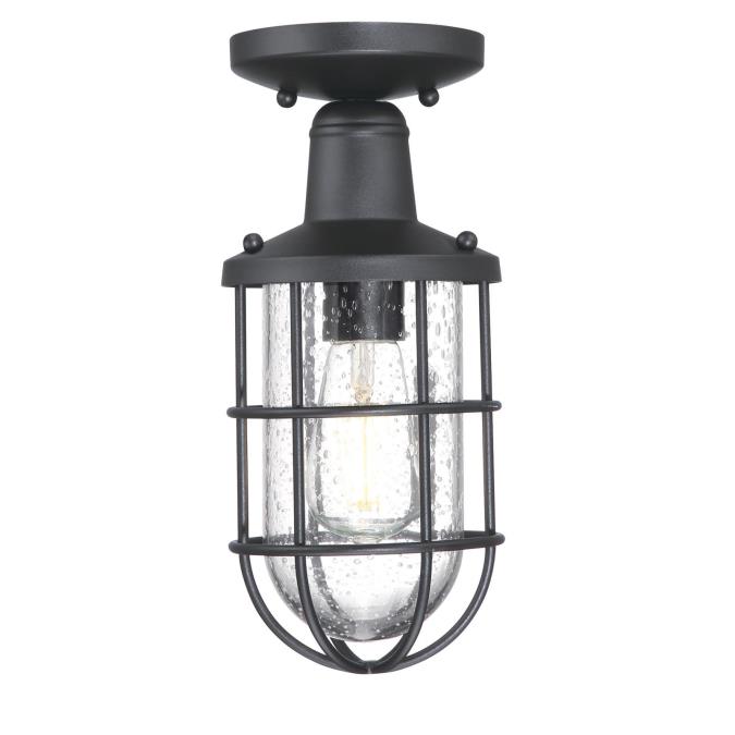 The Crestview outdoor semi-flush mount ceiling light adds a novel look to your front or back entryway, porch, or balcony. This fixture will enhance any outdoor setting with an understated style, finished in attractive, textured black. The design is reminiscent of nautical fixtures, created with cages to protect the glass against nature's elements. It exudes vintage-industrial charm, while the clear seeded glass adds textural interest and allure.